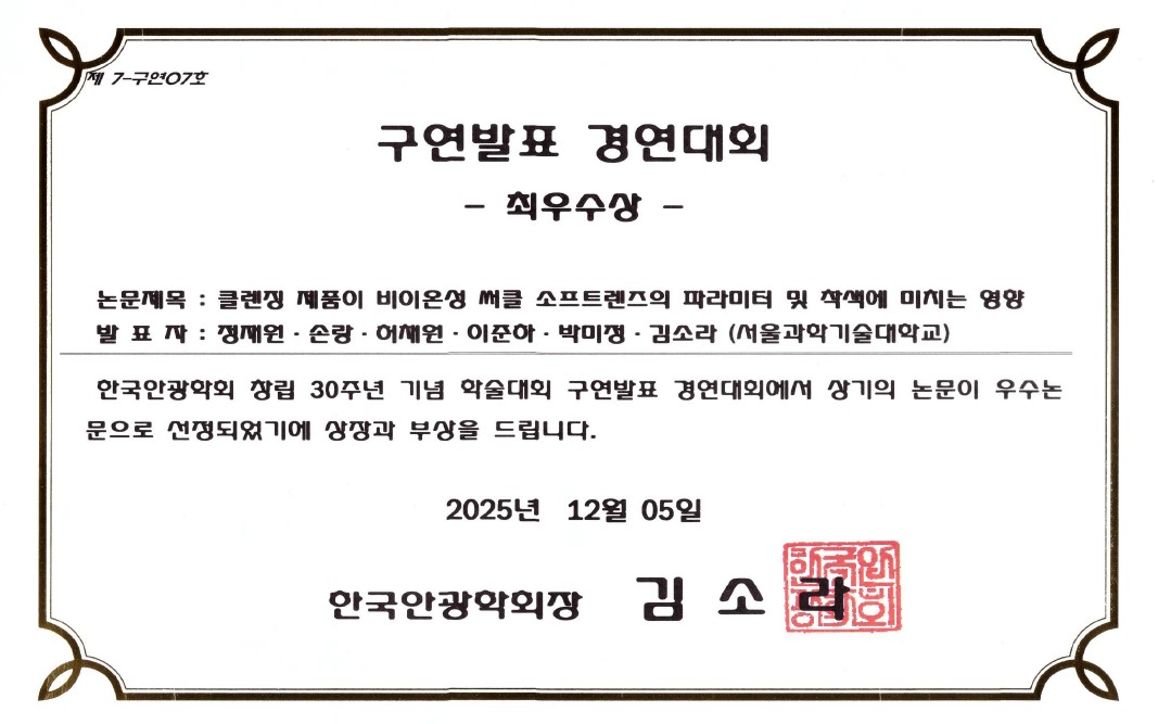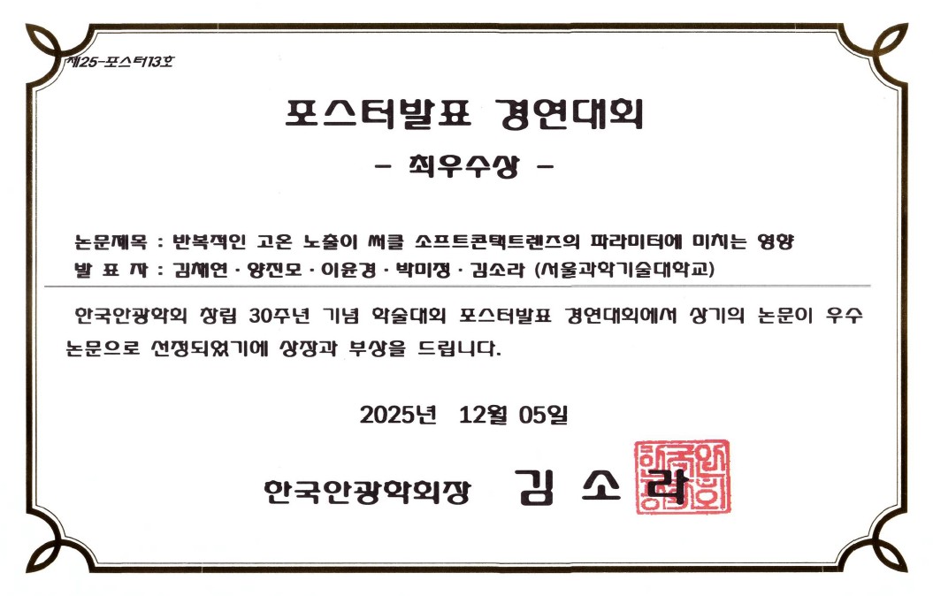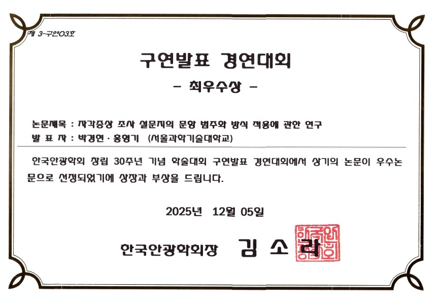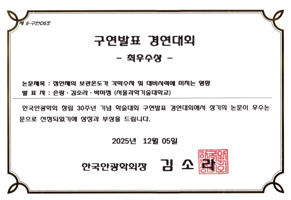 지난 12월 5일(금)부터 6일(토)까지 대전 선샤인호텔에서 개최된 **'2025년 한국안광학회 창립 30주년 기념학술대회'**에서 서울과학기술대학교 안경광학과 재학생 5명이 포스터발표 최우수상 및 구연발표 최우수상을 수상하였다.